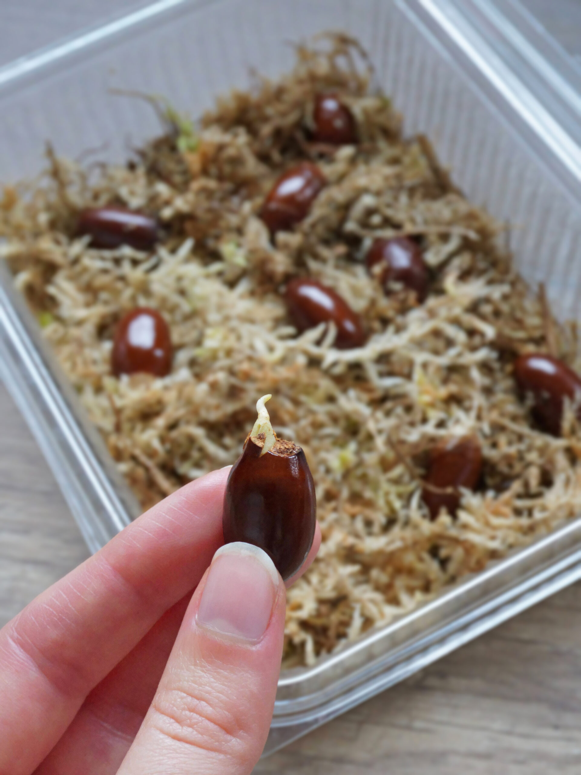 Remplissez un contenant de sphaigne humide. Enfoncez légèrement vos noyaux dedans. Refermez le contenant, et patientez. Aérez de temps en temps, et ré-humidifiez la sphaigne si besoin. Cette germination à l’étouffée fonctionne très bien !
